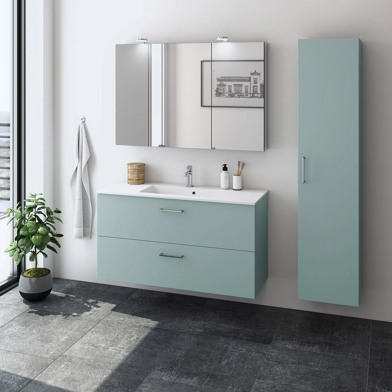 Die Beschreibung der Front- und Korpusfarbe bezieht sich auf den Waschtischunterschrank. Dabei sind „weiß matt“ und „fjordgrün“ immer in lackierter Ausführung.