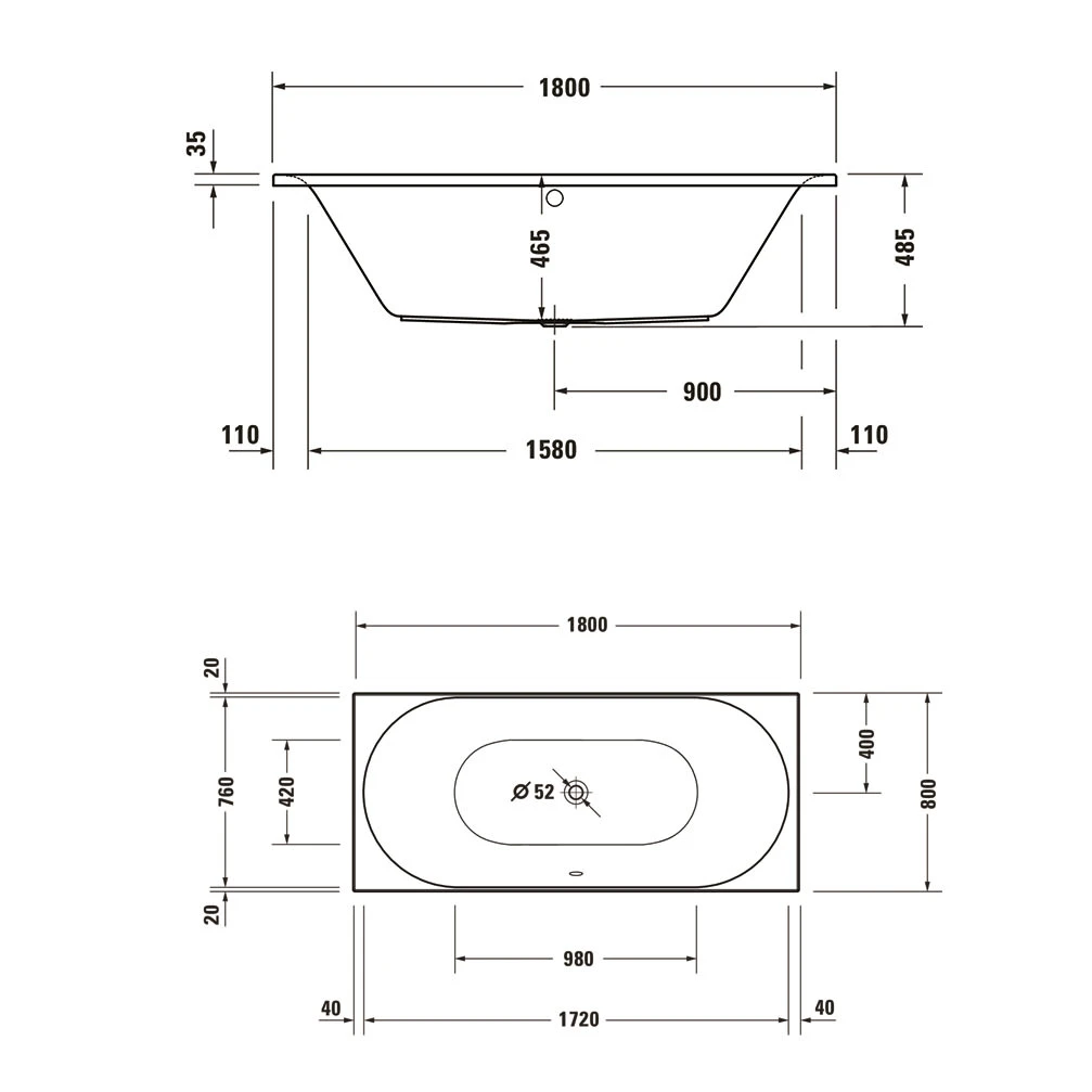 Duravit D-Neo Rechteck-Badewanne 180 x 80 cm, Einbauversion, Ab- und Überlauf mittig