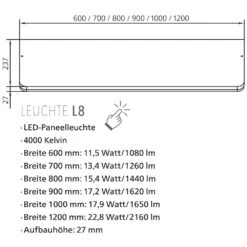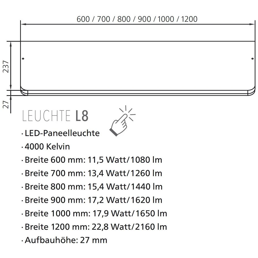 - mit 1 dimmbaren LED-Paneele L8 (Dimmen mittels des verdeckten Sensorschalters)