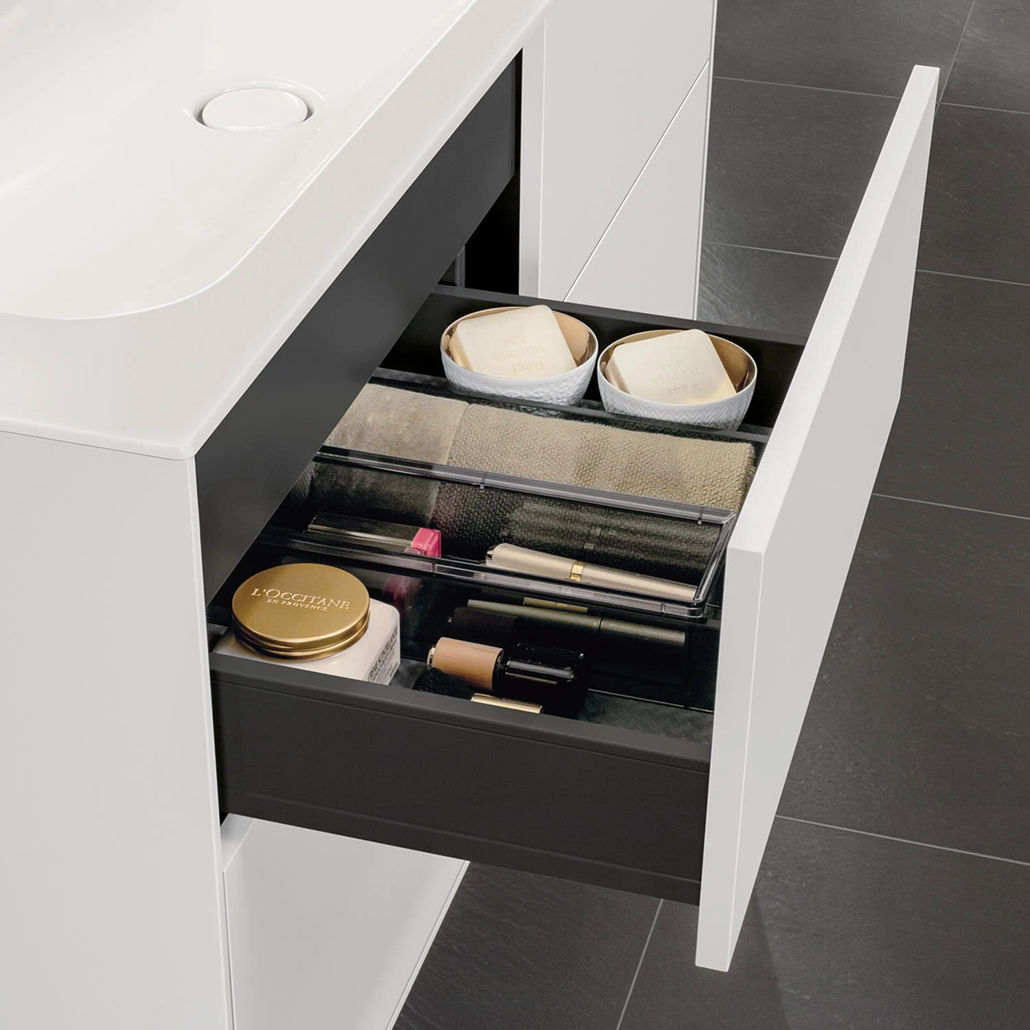 Dieser hochwertige Finion Unterschrank verfügt über eine stufenlos dimmbare Beleuchtung von Warmweiß bis Tageslichtweiß, welche über eine Fernbedienung steuerbar ist. An den Fronten des Unterschranks befinden sich keine Griffe. Hier erleichtert Ihnen die Push-to-open-Technologie von Villeroy & Boch den Alltag: Öffnen und Schließen Sie das Möbel mit einem einfachen Druck und genießen Sie das grifflose Design. Die praktische Innenaufteilung des Möbels sorgt für Ordnung und Übersichtlichkeit. Dank variabler Elemente wie Accessory Boxen unterschiedlicher Größen oder verstellbarer Glasabtrennungen finden sich häufig genutzte Badutensilien direkt auf den ersten Blick. Türen und Schubladen sind mit der modernen SoftClosing Technologie für sanftes und lautloses Schließen ausgestattet. Die Schublade wird durch den Mechanismus abgebremst und per Selbsteinzug langsam und geräuschlos zugezogen. Das ermöglicht problemloses Zugleiten auch bei schwer beladenen Auszügen und macht die tägliche Nutzung besonders komfortabel. Übrigens können die Schubladen dank Vollauszug in ihrer ganzen Tiefe geöffnet werden, damit Ihre Badutensilien direkt griffbereit sind. Übrigens: Der hochwertige Waschbeckenunterschränke hat einen Antirutsch-Boden in der Schubladen, sodass Ihre Badutensilien beim Öffnen und Schließen einen sicheren Halt haben.