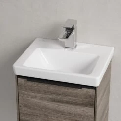 Das rechteckige Handwaschbecken zeigt sich gewohnt zeitlos. So passt es perfekt in die unterschiedlichsten Badsituationen. Sein schmaler Rand sorgt nicht nur für einen modernen Look, sondern auch für ein größeres Becken. Trotz kompakter Größe erfüllt es alle Anforderungen des Alltags und bietet ausreichend Platz zum Hände waschen oder Zähne putzen. Auf der Hahnlochbank findet sich genügend Platz für Seifenspender und andere Utensilien.