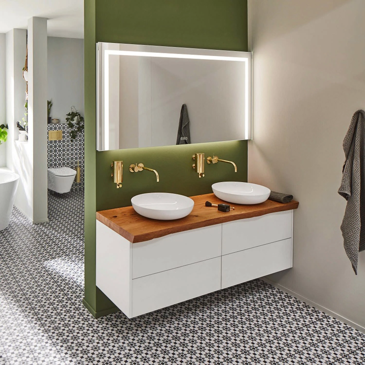 - durch indirekte Beleuchtung am unteren Spiegelrand setzt der Lichtspiegel dabei gleichzeitig Ihren Waschtisch und die Armaturen besonders in Szene